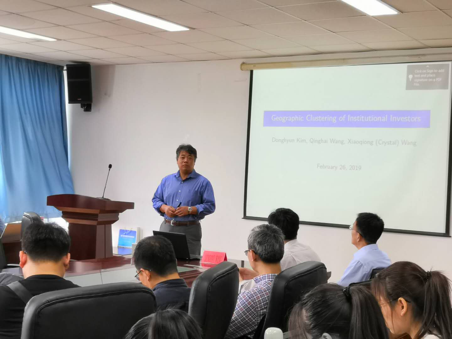 2019第15期“经济学名家讲堂”,为师生做了《Geographic Clustering of Institutional Investors》的精彩学术报告。