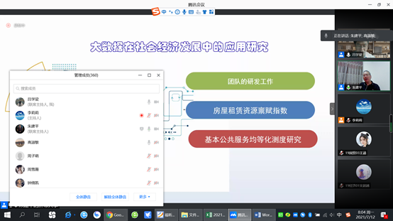 师生介绍了他的团队在零售业、物联网,电力和社会医学等领域应用数据分析的研发工作。随后基于中国市场现状和福建省租赁问题详细介绍了租赁房屋资源禀赋指数研究,为我们再现了该研究所建立系统的实用性。朱建教授结合研究主题,基于政策与我国现状,通过构建基本公共服务水平测度指标体系在解决公共服务区域不均衡方面进行了深入探索。