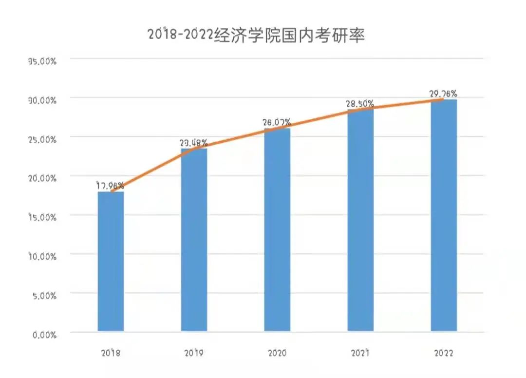 不仅总体深造率有较大提升,优秀的考研集体也不断涌现——金融二班、金融五班、国贸三班、经统二班四个班级国内考研率分别达到41.18%、42.86%、42.3%以及41.67%,各专业考研率齐头并进。其中,财政系的国内上岸率高达38.89%。