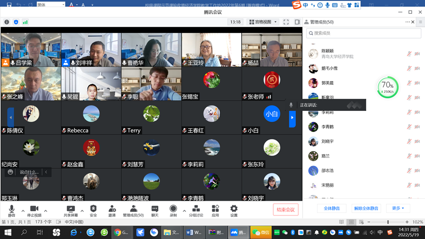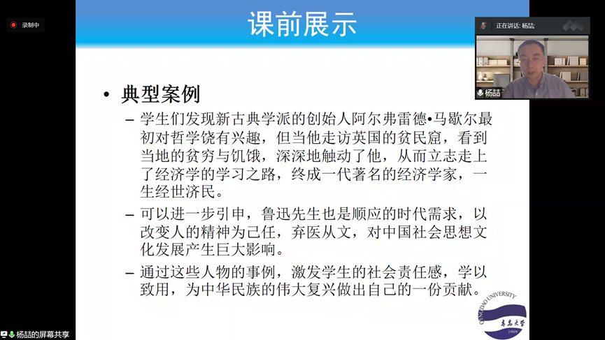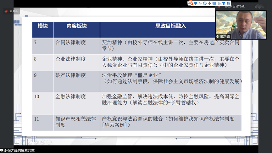 李莉莉老师、张之峰老师、李聪老师、杨喆老师分别汇报了立项建设的《多元统计分析》《经济法》《投资银行学》《微观经济学》四门课程思政示范课的建设情况。四位老师的报告精彩纷呈,既有考核方式的改革,又有生动案例的导入,既有思政目标的有效融入,又有思政教育的全过程设计。