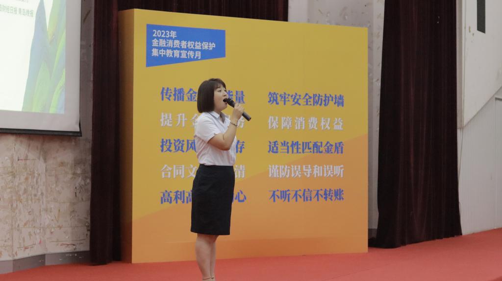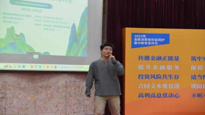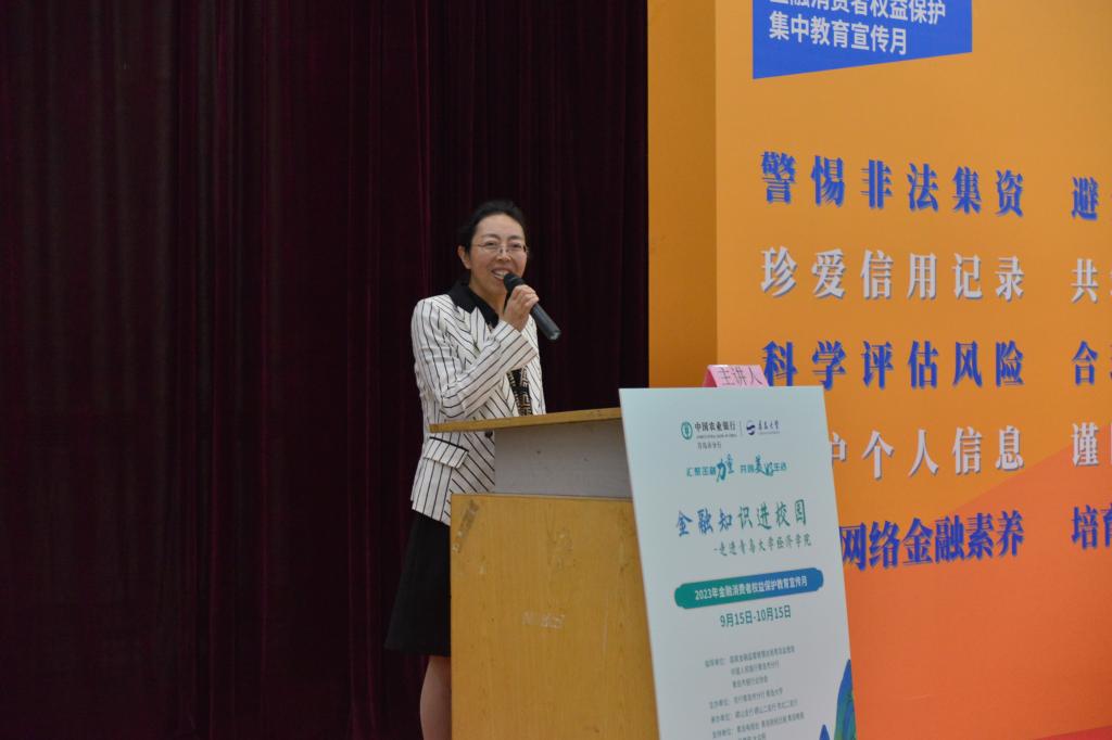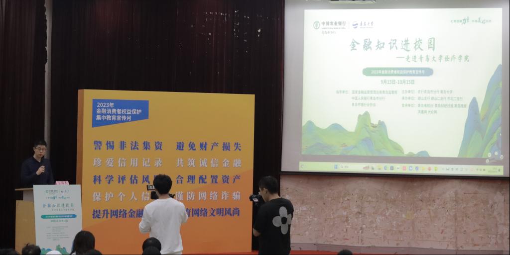 在致辞中黄鑫表示,9月15日—10月15日以“汇聚金融力量 共创美好生活”为主题的2023年“金融消费者权益保护教育宣传月”在全国开展。中国农业银行青岛市分行携手青岛大学广大师生,将金融知识融入教育场景,坚持以人民为中心的发展思想,密切开展银行和学校的合作。希望通过本次宣讲,防范非法金融活动,保护好大家的钱袋子。