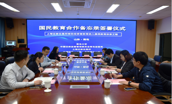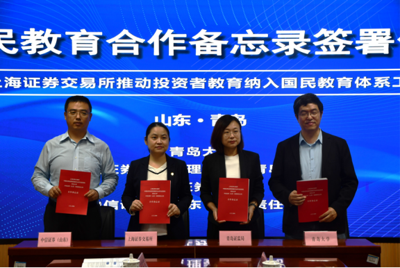 在平等自愿、互利共惠、共同发展的原则下,青岛大学、中国证券监督管理委员会青岛监管局、上海证券交易所、中信证券(山东)有限责任公司四方代表就学科建设、学术研究、人才培训等领域达成广泛、长期的合作关系。这一合作将充分发挥各方的资源及专业优势,共同推动投资者教育纳入国民教育体系这一目标的实现。