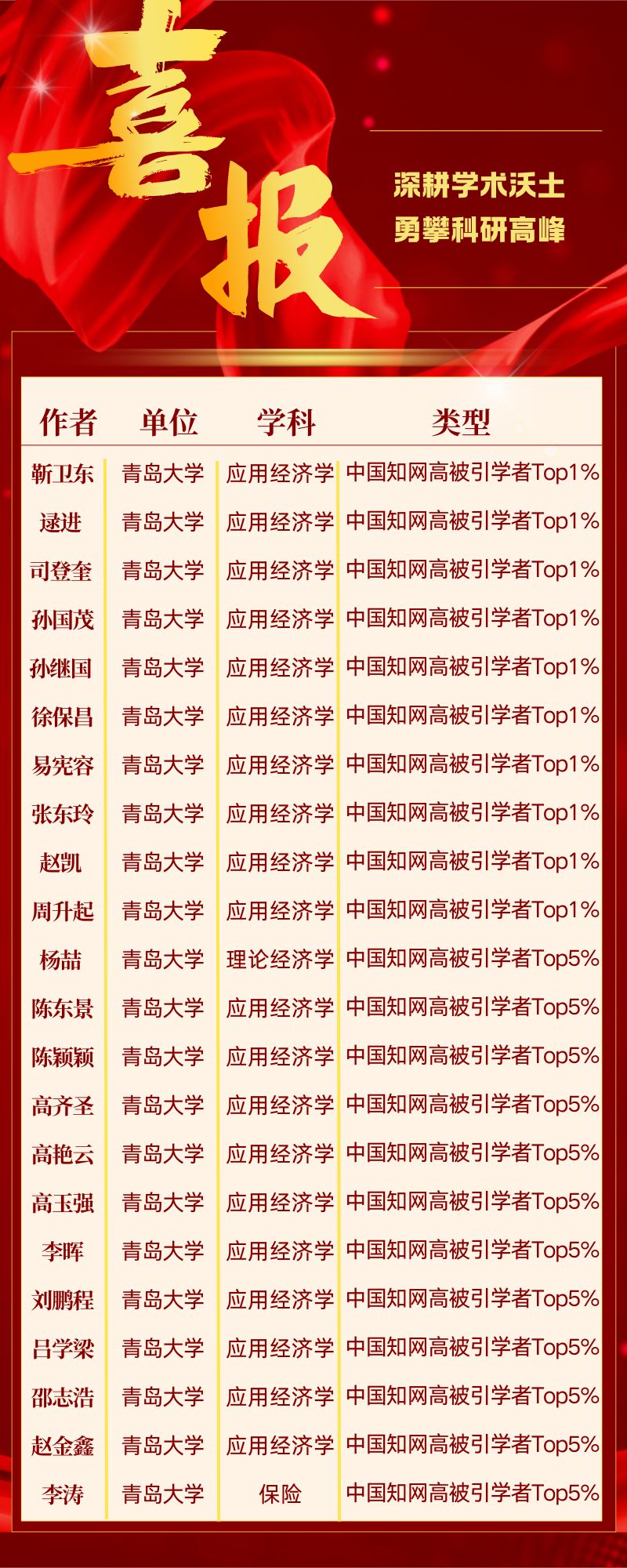 成绩斐然,共有22位教师脱颖而出。其中,靳卫东、逯进、司登奎等10位教师成功入选中国知网高被引学者Top1%,杨喆、陈东景、陈颖颖等12位教师同样表现亮眼,入选中国知网高被引学者Top5%,充分展现了必威