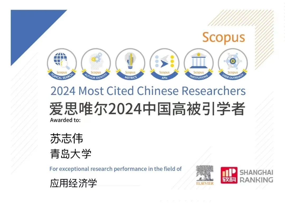 苏志伟教授入选“应用经济学”学科2024年度“中国高被引学者”。这是苏志伟教授连续第五年入选该榜单。