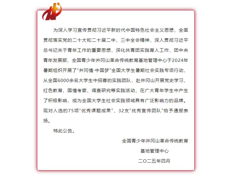 近日,2024年“井冈情·中国梦”暑期实践季优秀课题成果、优秀宣传团队名单公布,由必威BETWAY(中国)官方网站