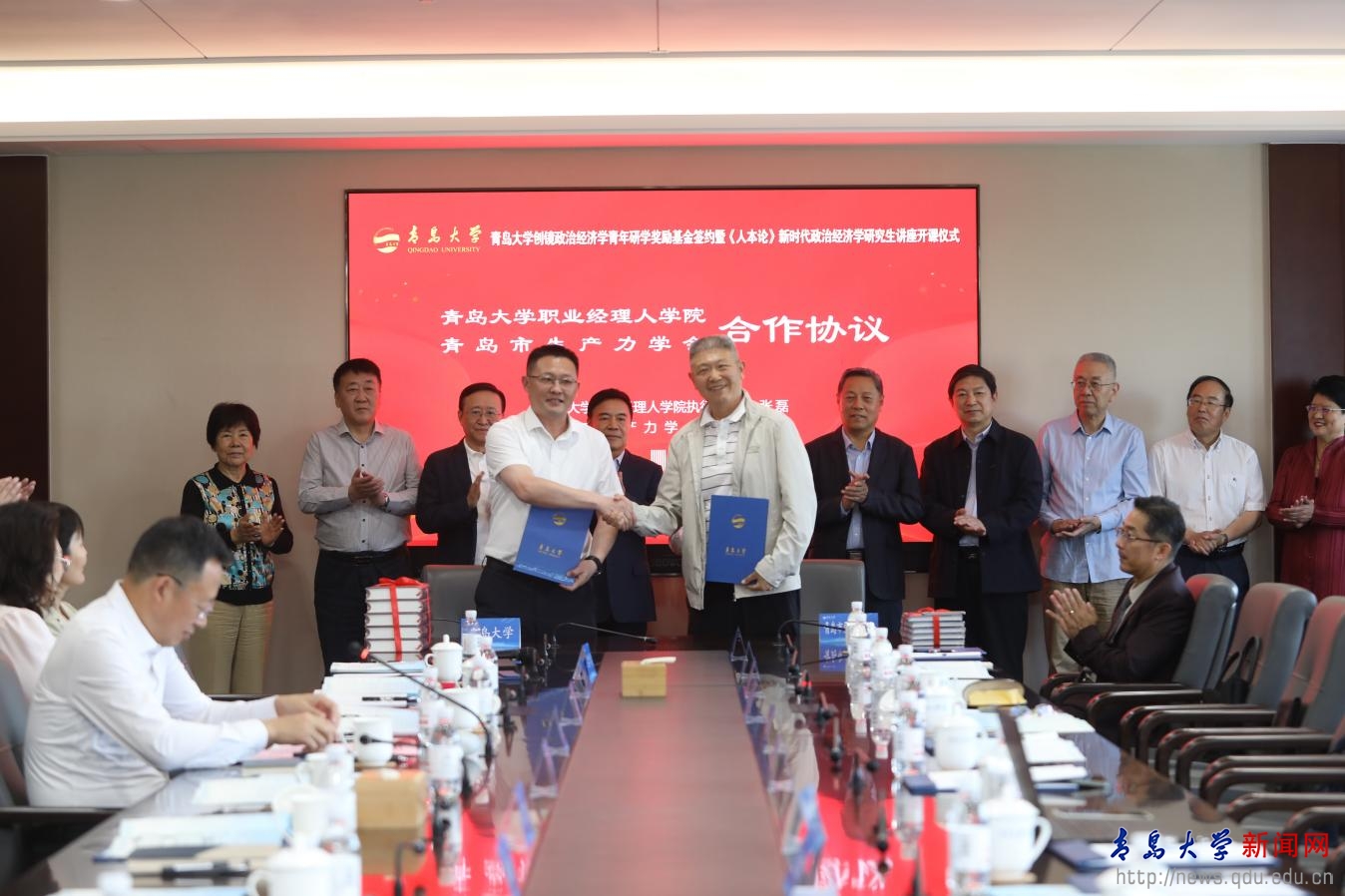 执行院长张磊与青岛市生产力学会秘书长冯显泉签署合作协议。