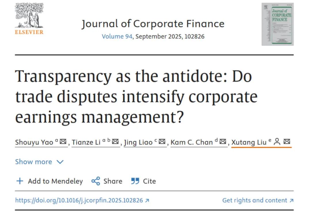 青年教师刘旭堂在金融学国际权威期刊Journal of Corporate Finance上发表题为“Transparency as the antidote: Do trade disputes intensify corporate earnings management?”的研究成果。刘旭堂为唯一通讯作者,青岛大学为唯一通讯作者单位。