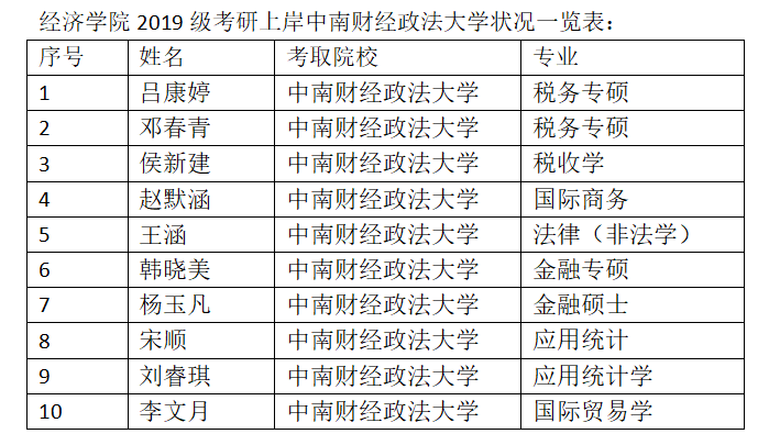 其中3名财政专业学生、2名国贸专业学生、2名金融专业学生、2名经济统计专业学生、1名跨境电商专业学生,共10名同学成功上岸中南财!